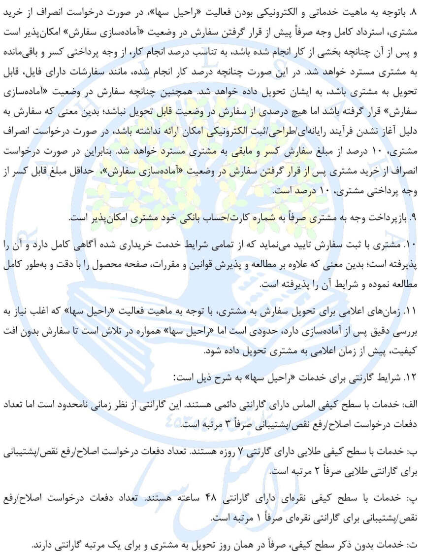 27. در صورت عدم ذکر شرایط گارانتی در صفحه محصول، محصول فاقد گارانتی است اما در خصوص خدمات، شرایط گارانتی مطابق با بند 12 برقرار است.