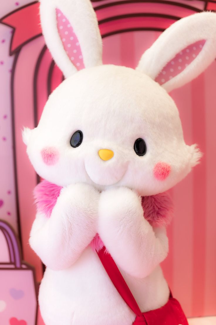 ظاهر: خرگوش صورتی با گوش‌های بلند، چشمان مهربون و یه روبان بزرگ