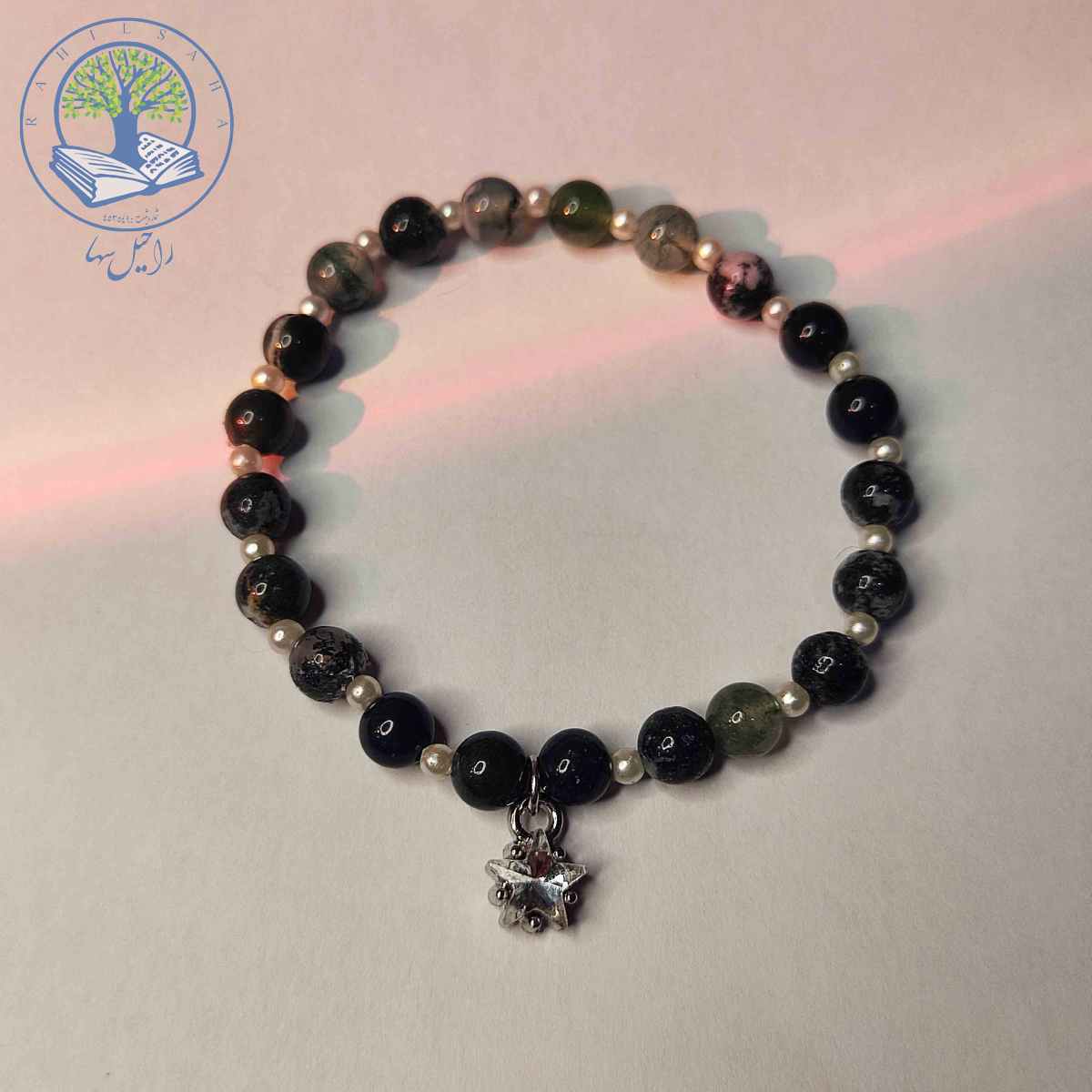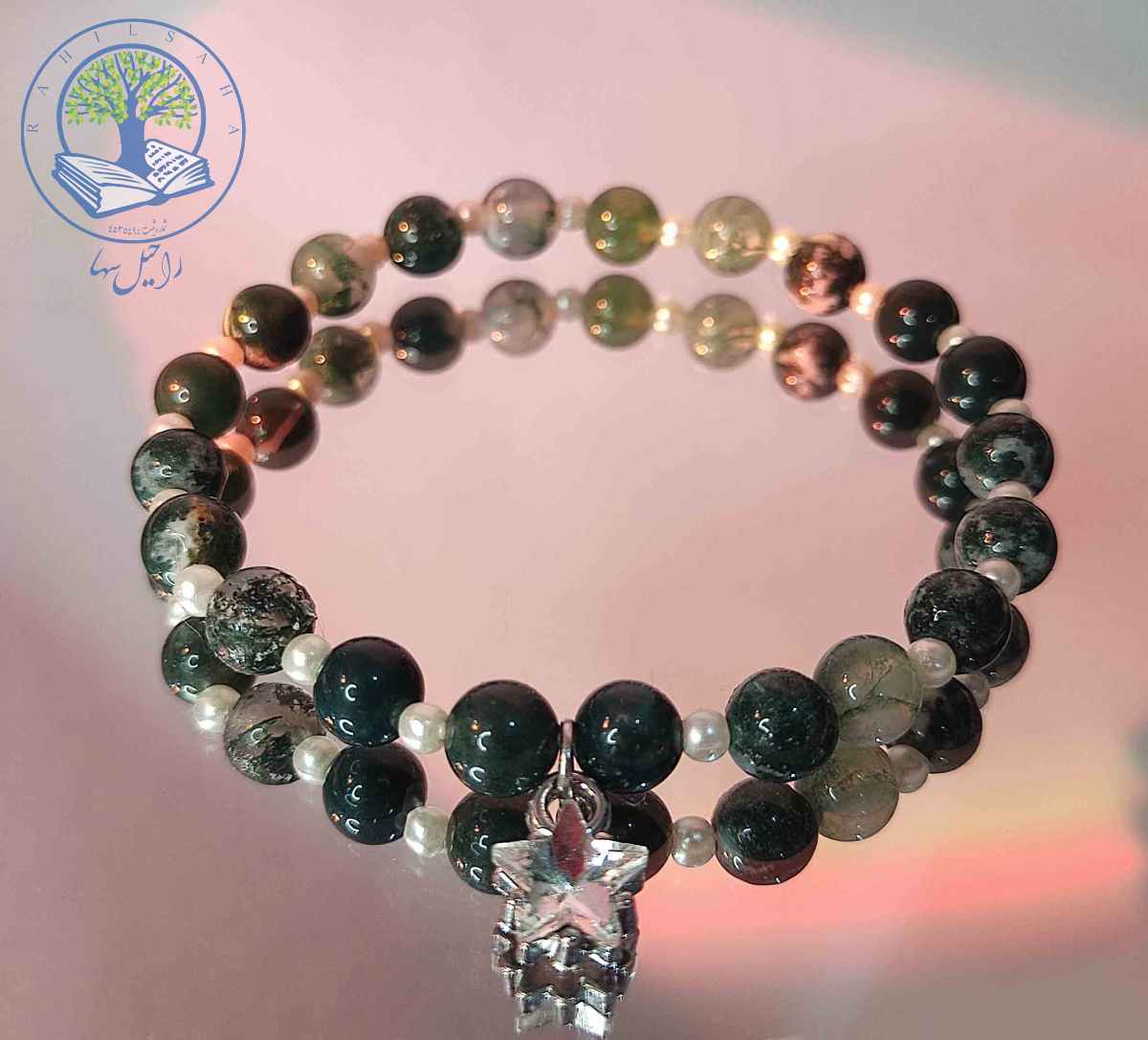 دستبند تک ردیف سنگ طبیعی عقیق خزه ای آویز دار