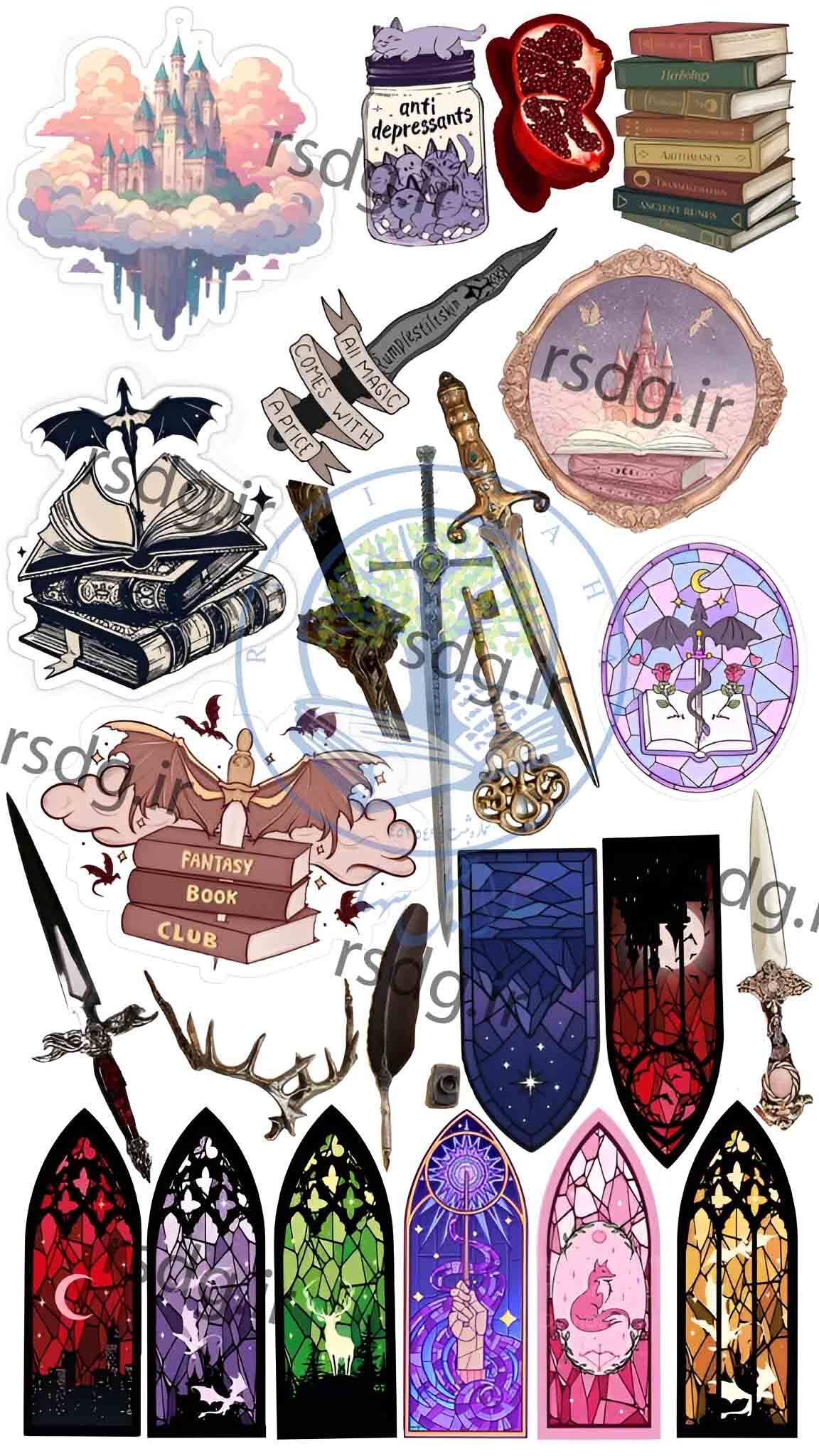 استیکر بدون برش پینترستی تم کتاب های فانتزی مناسب اسکرپ بوک